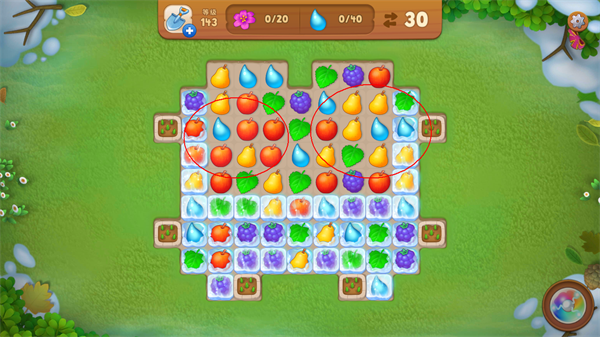 The flower beds in this level are relatively scattered. It is better to choose the flower beds below to synthesize flowers. The flower beds above use the chain reaction caused by elimination to synthesize flowers.