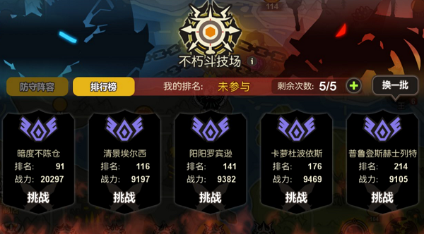 3. At 0:00 every day, the number of challenges in the arena is refreshed 5 times (each arena is independent). Each challenge consumes 1 point, and the number of challenges can be purchased through colored diamonds.
