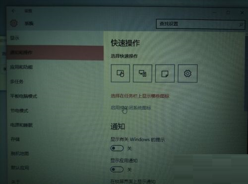 2. Then in the pop-up window, select the second "Notifications and Actions" on the left column, and then click "Turn system icons on or off" on the right.