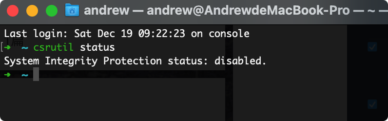 Enter the command csrutil status in the terminal to check whether the status is disabled, as shown in the following figure: