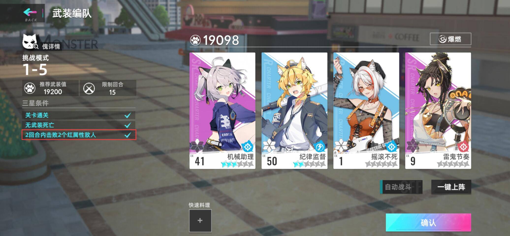 In the Cat City game, players can use their current full-output weapons at 1-5 (it is recommended to choose blue attribute weapons to restrain red attribute enemies) to facilitate the completion of the three-star condition.