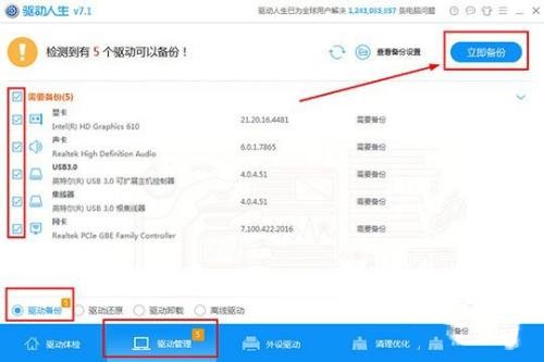 Click Select in the column below to enter the driver management column interface, and then directly click the "Drive Backup" function option in the lower left corner. In the driver backup interface, directly select the driver you want to back up. Basically, you only need to select all, and then click the "Backup Now" option to start the backup! As shown in the figure below: