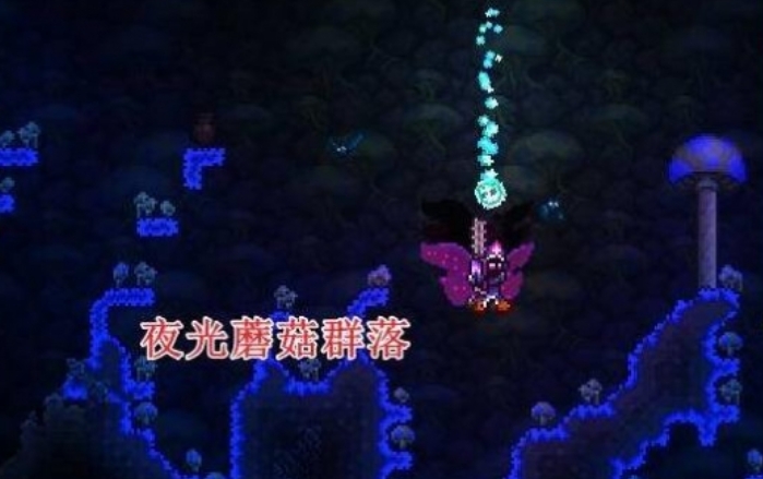 Enter the underground areas of the world of Terraria to find colonies of glowing mushrooms. These colonies are usually found in caves deeper underground, in dark environments with mushrooms growing in the background.