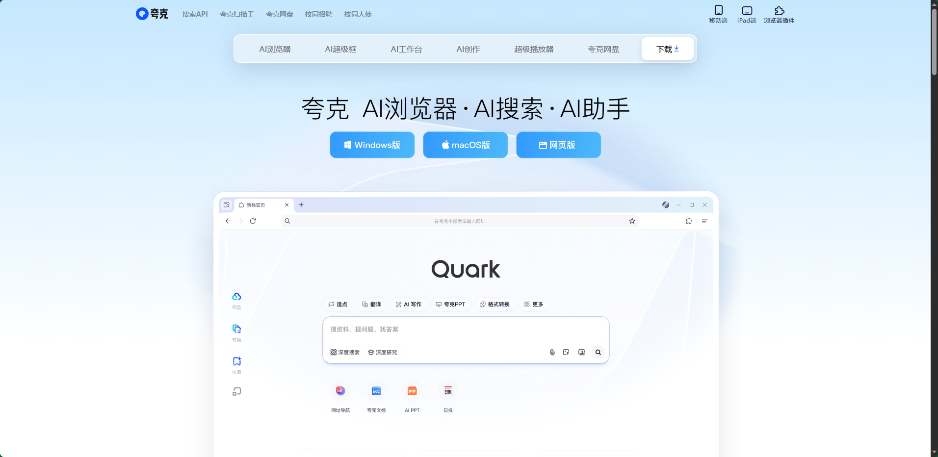 The deep integration of AI intelligent assistant makes the web version experience more convenient. Press the custom shortcut key to wake up the floating window assistant, which supports text polishing, translation, PPT outline generation and other functions. Students can use screenshots to search for questions to quickly get ideas for solving problems, and office workers can use AI to refine the core points of long documents, generate meeting minutes, and complete various tasks without switching pages. The website navigation page integrates frequently used sites. Users can customize frequently used links to shorten access paths, and it is equipped with practical functions such as web page snapshots and offline saving. Whether it is efficient office work, quick search, or daily browsing, Quark Browser web version can provide comprehensive Internet support in a lightweight form to meet the diverse needs of different users.