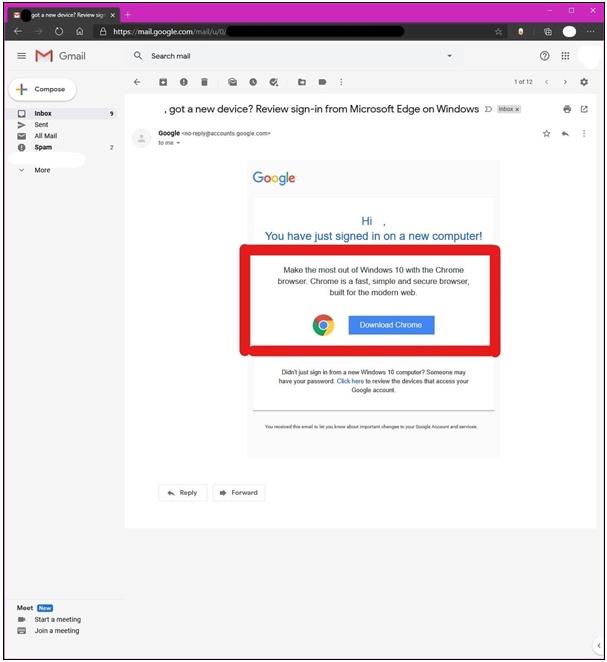 It is reported that although the email ostensibly warns users who have logged into Gmail on a new computer, after clicking on the email, most of the content is an advertisement for the Chrome browser, and it also comes with a download link.