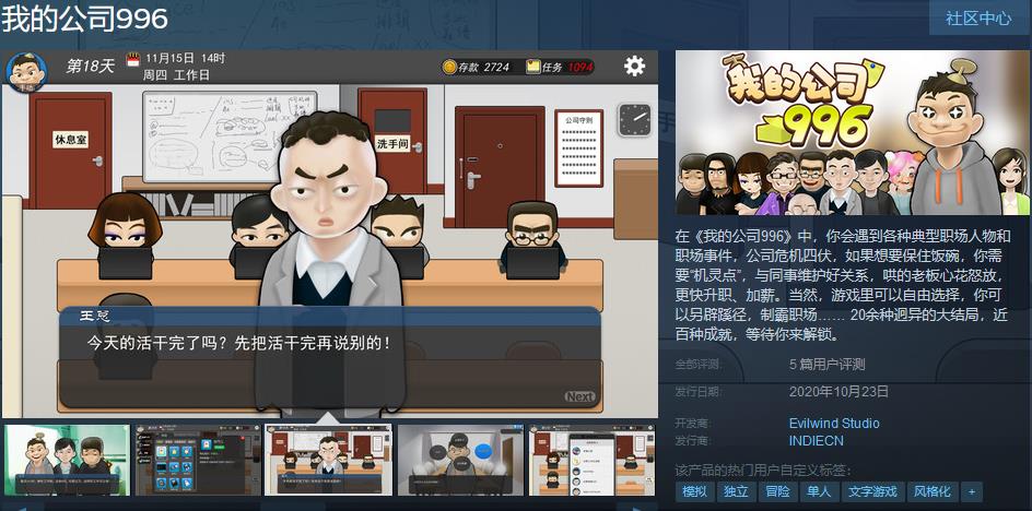 Today, "My Company 996" developed by Evilwind Studio has been officially released on Steam. The game sells for 36 yuan, and is currently on special sale for only 32 yuan. The event ends on October 30.