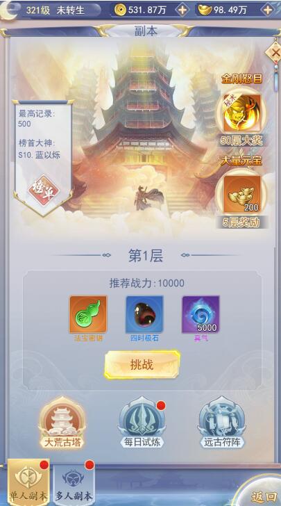 In addition, you can also get gems and infuriating rewards by clearing the Great Wilderness Ancient Tower. When the level of clearance reaches a multiple of 5, you can also get ingot rewards.