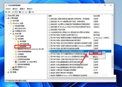 3. Next we expand as shown, find the "User Account Control: Run all administrators in administrator annotation mode" item on the right and right-click to select the "Properties" item.