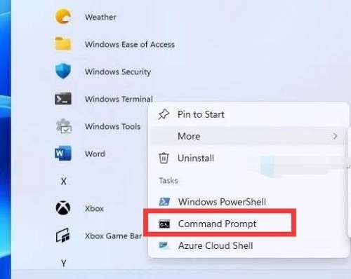 5. Another way is to run a specific command through the command prompt. As shown in the picture, click on the Win11 start menu and select "Windows The "command Prompt" item in the "Tools" menu opens.
