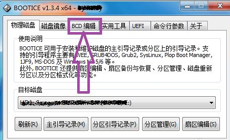 After the installation is complete, open the "bootice" software and you can see "BCD Editing" in the menu above the software window.