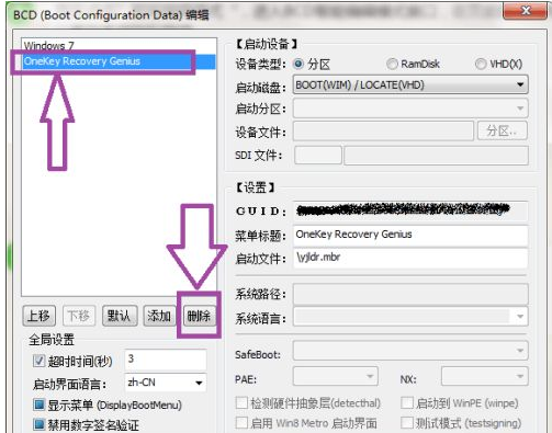 Next, click to select "onekey ghost" in the boot item, and then click "Delete" on the page to delete onekey ghost.