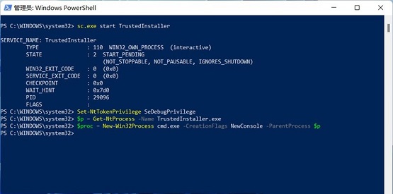 sc.exe start TrustedInstallerSet-NtTokenPrivilege SeDebugPrivilege$p = Get-NtProcess -Name TrustedInstaller.exe$proc = New-Win32Process cmd.exe -CreationFlags NewConsole -ParentProcess $p