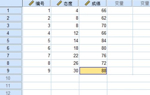 Step 2: Then we enter the relevant data in the data view, the attitude and test scores corresponding to the numbers (as shown in the figure).