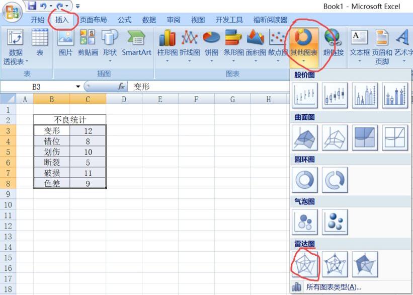 Then, click Insert, other icons, and the first icon of the radar chart, as shown in the figure;