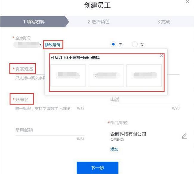 In the second step, the Qidian account number is the QQ system number (the number can only be selected when creating a member, and is not selected when editing existing members), the real name is the internal display nickname, the account name is the unique identification within the Qidian system, and the external nickname is the customer-facing session nickname.