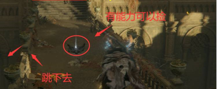 3. After going down the stairs, you will reach the most difficult part of this area. You need to go through the heavily guarded bridge in front to the gate behind the incarnation of the golden tree. You can jump from the railing on the left to reach the platform below the bridge. There is a ladder in front. Climb up the ladder to avoid unnecessary casualties.