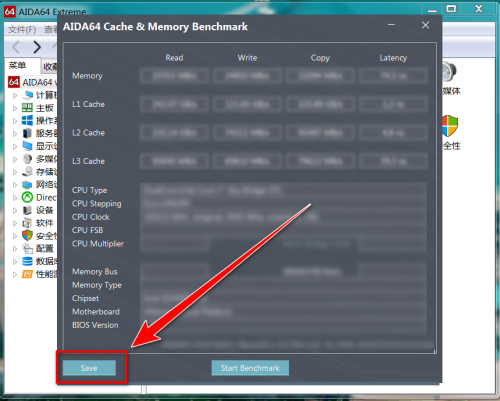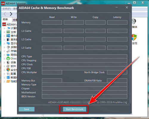Step 4: In the "Memory and Cache Test" window, click "Start" in the middle Benchmark" button. The Memory items in the first row are performance test results such as memory read and write latency. You can see the memory frequency in Memory Type.