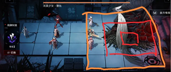 The orange writing is the normal attack range of the gray-haired girl. As long as the followers are placed outside it, they will not be harmed except for imprisonment.