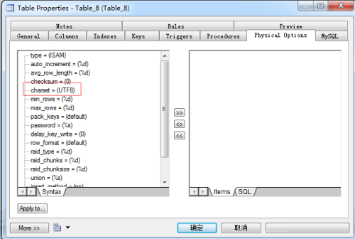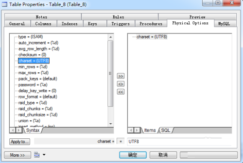 Step 3: The following file box will pop up, select the "Physical Options" option, and select "charset=(utf8)".