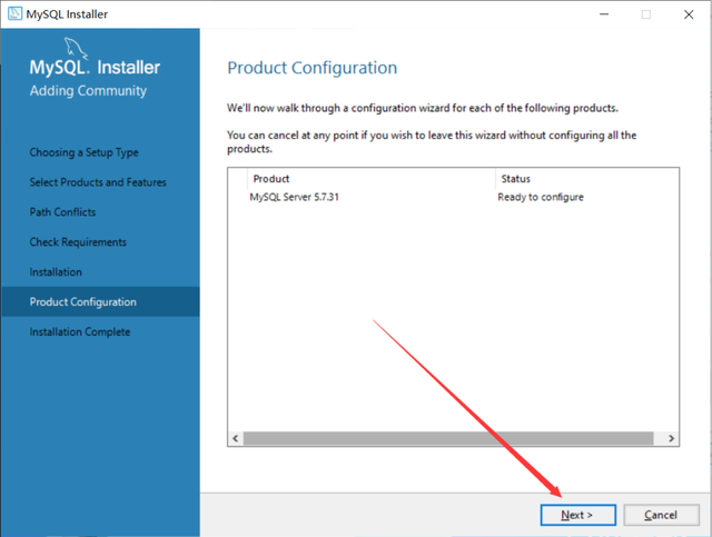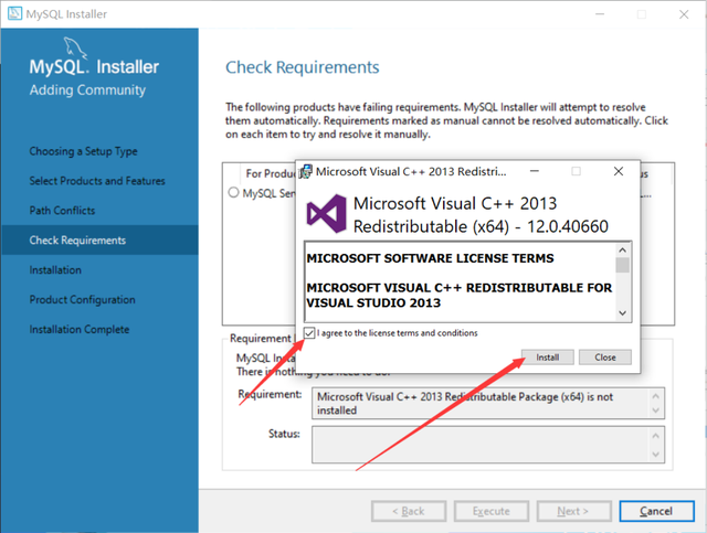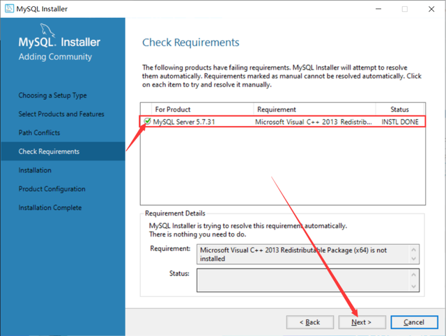 9. First select "MySQL Server5.7.31". If this environment does not exist on your computer, you will be prompted to install the "Microsoft Visual C++ 2013" environment. Click "Execute"