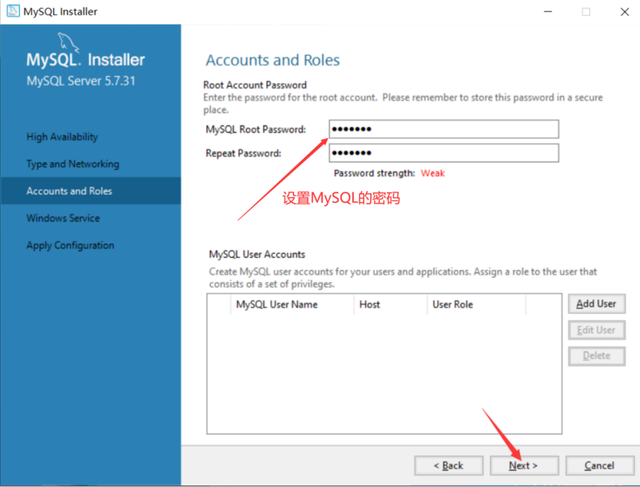 19. Here you need to set the MySQL password. It does not need to be too complicated. Just click "Next" after setting it up.