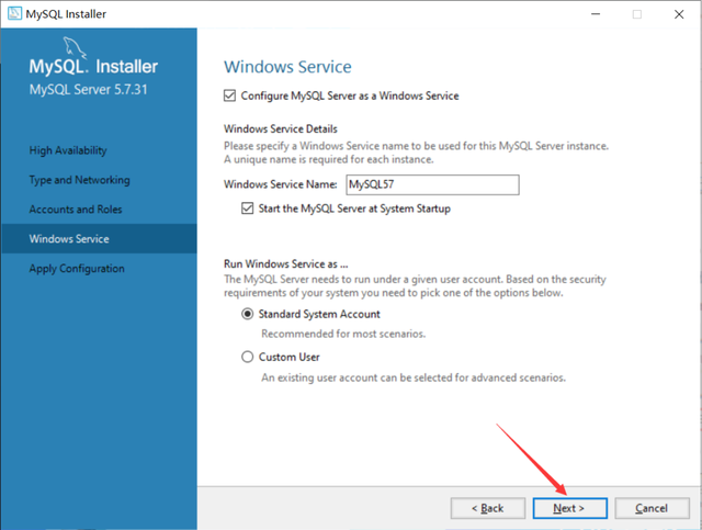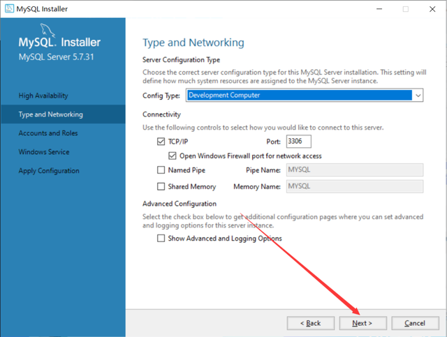 3. First select "MySQL Server 5.7.31", then click the blue "Advanced Options" below