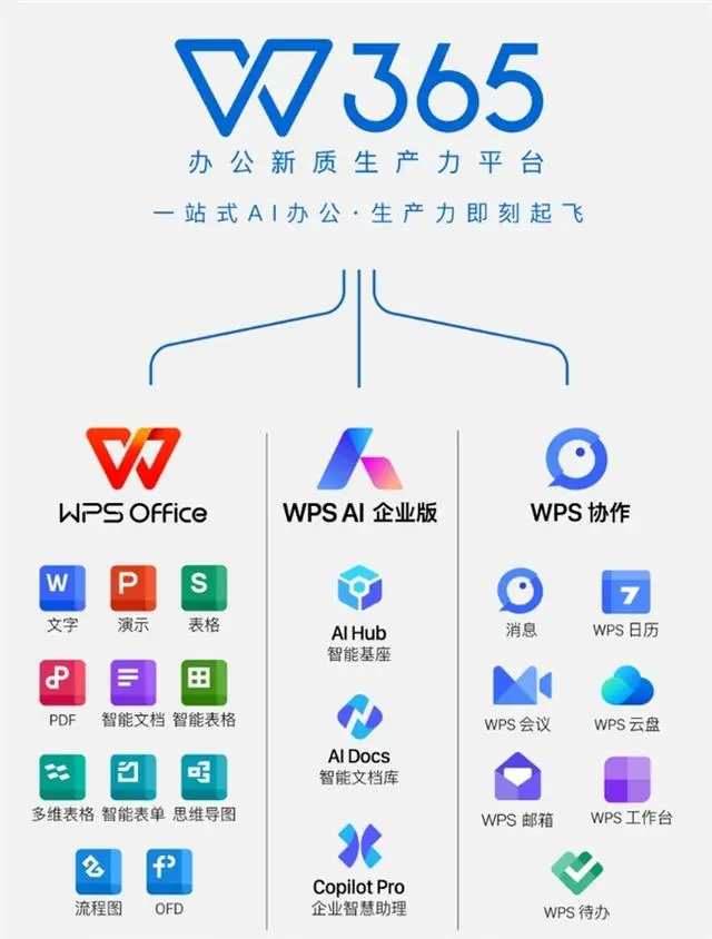 WPS 365 launched by Kingsoft Office is a one-stop office platform integrated with AI, aiming to comprehensively improve corporate office efficiency. The platform includes core components such as WPS Office, WPS AI Enterprise Edition and WPS Collaboration, and fully covers diversified office needs such as document creation, instant messaging, conference management and email processing.