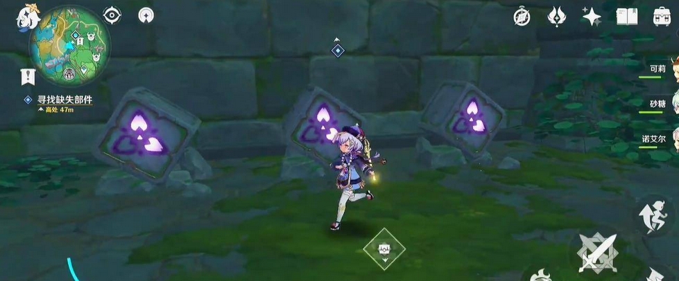 6. After defeating the monsters, go to the three purple stone tablets and hit them twice in the middle and twice on the right to make them look like the three in the picture.