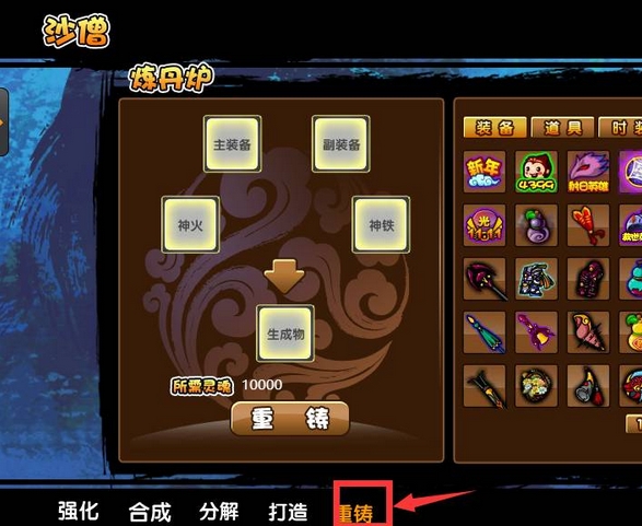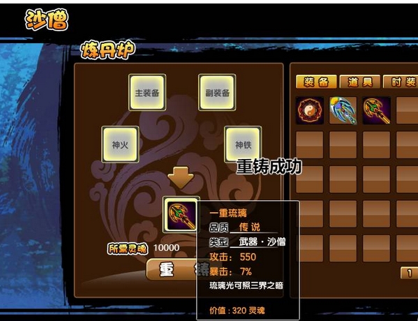 3. Then the player puts the equipment he wants to reforge in the bead equipment column. The secondary equipment column must have the same name as the main equipment (the name is exactly the same), and the corresponding divine iron and divine fire must be placed in the two columns under the equipment. Let’s take Sha Monk’s legendary weapon “Liu Li” as an example.