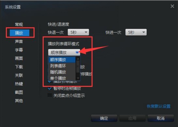 2. In the window interface that opens, click the "Play" option in the left column, then find "Playlist Loop Mode" on the right, click the drop-down button of the option box, select "Loop Play" from the option list given below, and finally click "OK" to save.