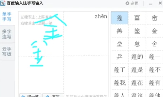 After enabling handwriting input, you can use your mouse or touch screen to write Chinese characters. The written Chinese characters will display the text to be selected on the right, and you can click on the correct text to complete the input.
