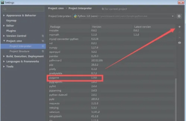 Open the PyCharm tool. Select File -> Settings (or Preferences, depending on your operating system). In the settings window, select Project: <your project name> -> Python Interpreter. Check the list of installed packages on the right to confirm whether pygame is included. If not, click the + button in the lower right corner, search for pygame and install it.