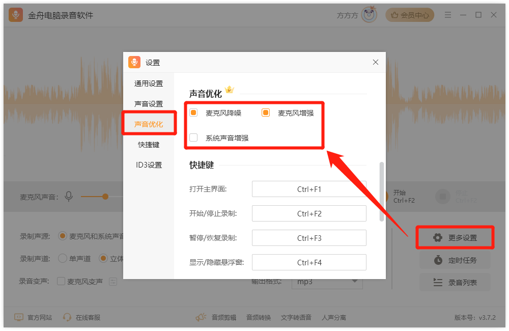 You can also click "More Settings" to perform sound optimization settings such as microphone noise reduction and enhancement to achieve better recording effects.