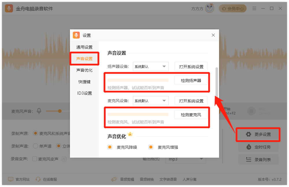Step 3: Before recording, you can click "Sound Settings" in "More Settings" and click to detect the speaker and microphone equipment to ensure they can be used normally.