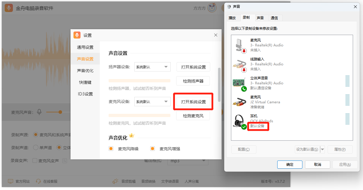 If you cannot hear the sound, you can click "Open System Settings" to check whether the default device is set correctly and is not disabled. Set the correct default device and connect normally before trying again.