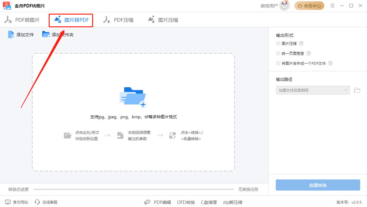 Step 3. After importing, you can set the output format of the PDF document on the right side of the software, including image compression, unified page width, and merging images into one PDF file. After the settings are completed, click the [Batch Conversion] button on the lower right to convert all jpg to pdf at once.
