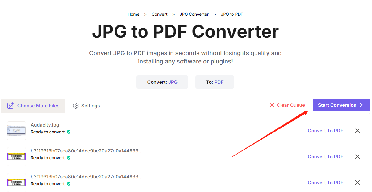 Step 1. Open the browser on your computer, enter Pixeled JPG to PDF Converte in the search box and click to enter the website. Confirm that the [JPG] format is selected in Convert and the [PDF] format is selected in To. Then click [Choose Files] to upload the jpg photos you want to convert.