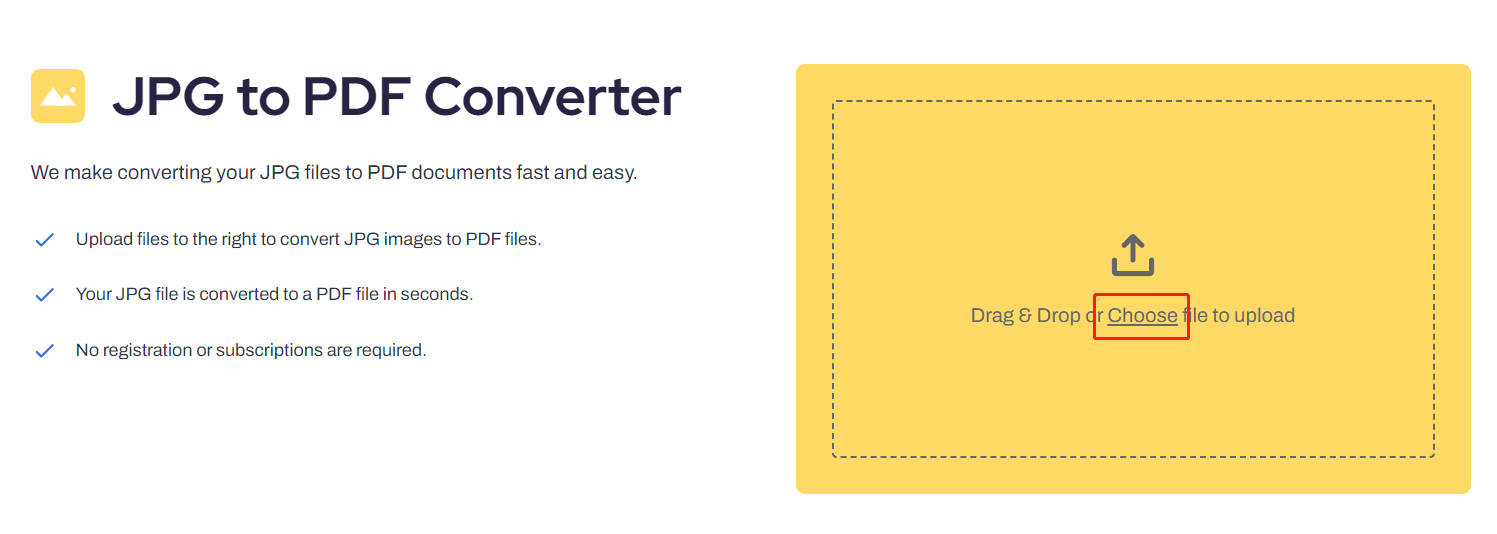 Step 1. Open the JPG to PDF Converter online software on your browser. After entering the main interface of the software, click the [Choose] button in the yellow box to import the jpg photo files that need to be converted into PDF into the tool interface.
