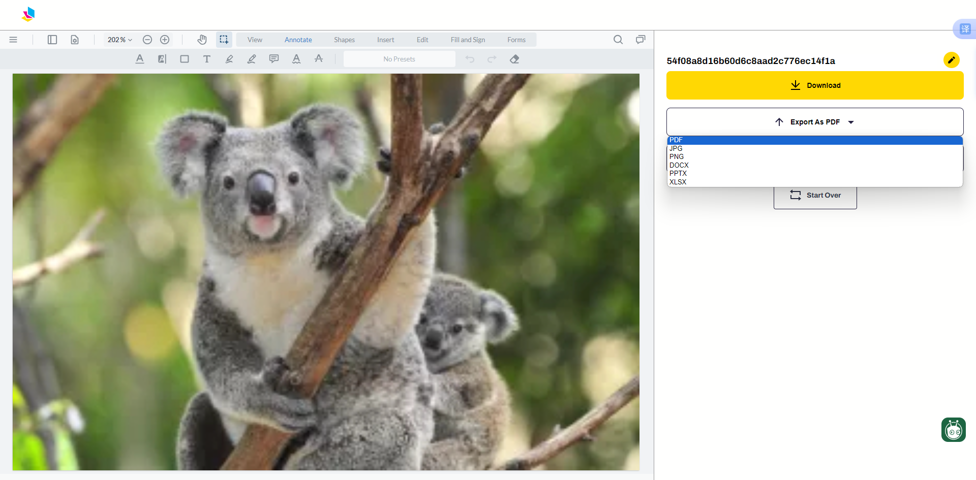 Step 2: Wait patiently for the photo to be uploaded, then click the [Export As PDF] button on the right side of the page and select the PDF format.