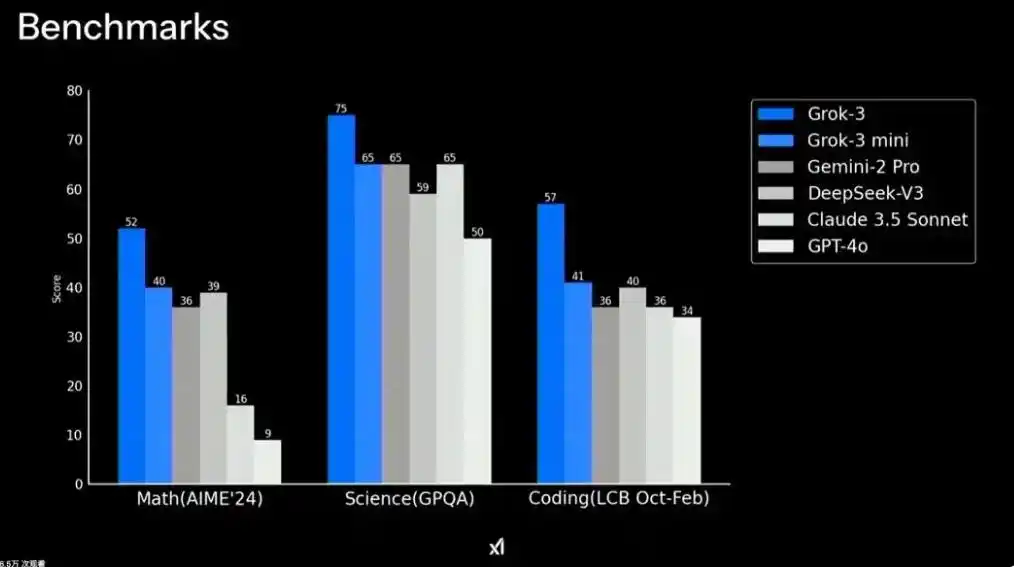 During the live broadcast that day, Musk and three engineers from xAI conducted a live demonstration. Grok 3 performed well on math, science, and programming benchmarks, outperforming Google’s Gemini, DeepSeek’s V3 model, Anthropic’s Claude, and OpenAI’s GPT-4o.