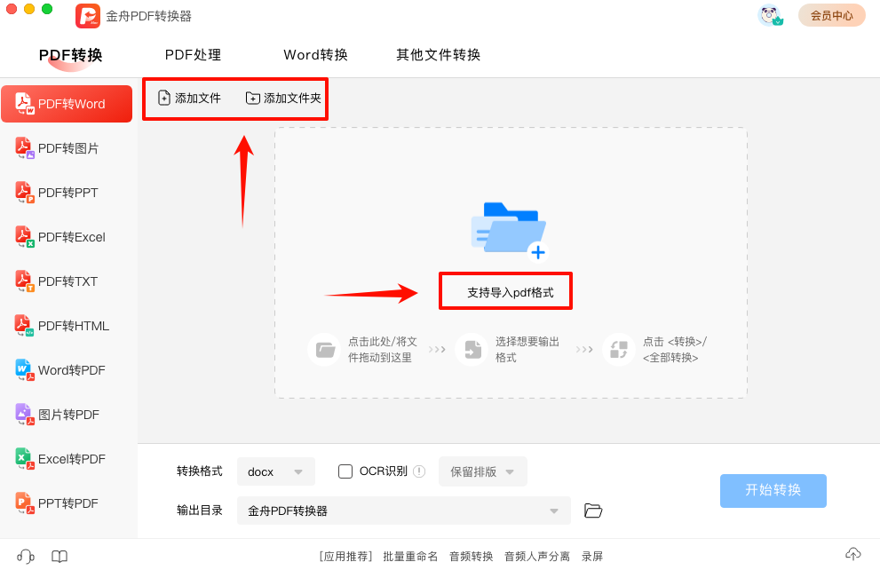 The first step is to install Jinzhou PDF Converter, double-click the shortcut on the desktop, and run it to enter the software page. The PDF to Word function is selected by default in the left function bar. Add PDF files or batch drag and drop the files to be converted into the blank space of the software.
