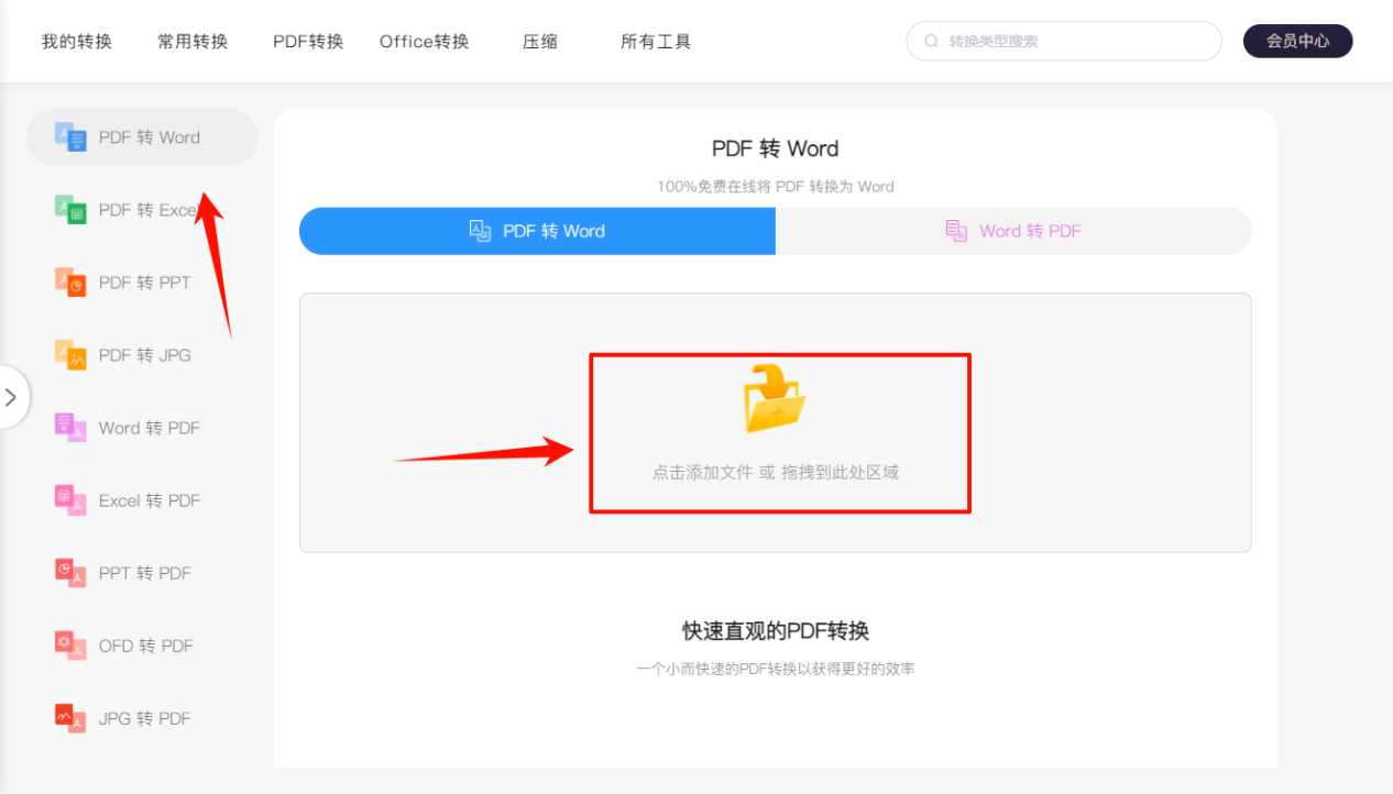 The first step is to open the conversion tool, select [PDF to Word], click to add files/drag files to the software prompt area.
