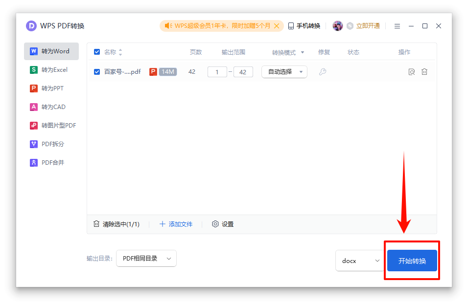 In the second step, after adding the PDF file, set the conversion format docx/doc, and you can also check OCR for scanned file recognition.