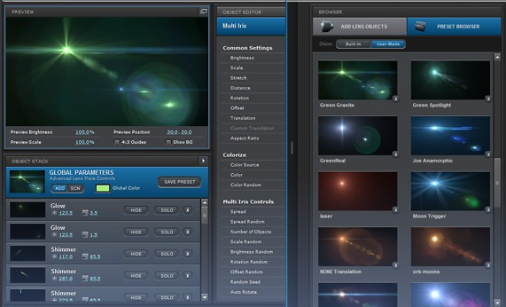 Build stunning lens flares by using 12 powerful core objects. These elements provide unparalleled flexibility with detailed control settings.
