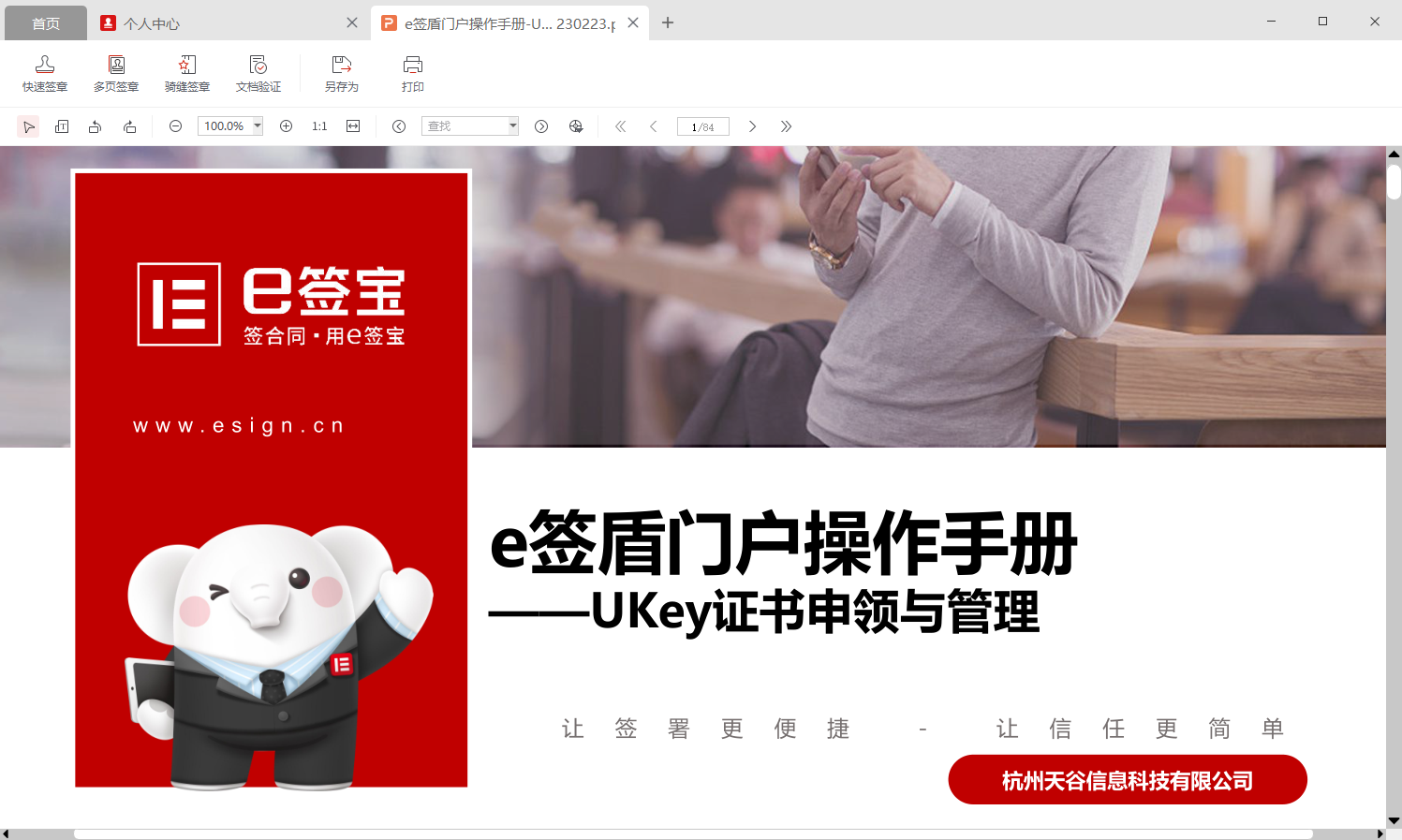 E-Sign Bao client is a software developed by Hangzhou Tiangu Technology Information Co., Ltd. that provides document reading, signing, and verification for small and medium-sized enterprises. The software supports single signature, multiple signatures, multi-page signatures and seam seals. For the existing seals in the document, you can perform seal verification on them to confirm whether the seal is valid.