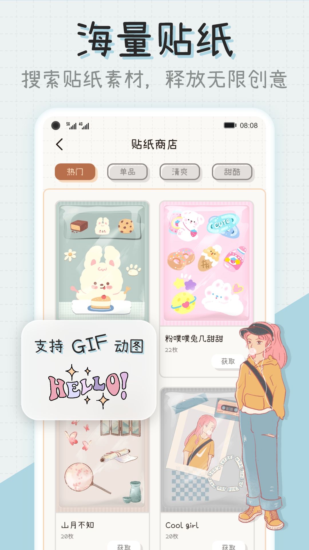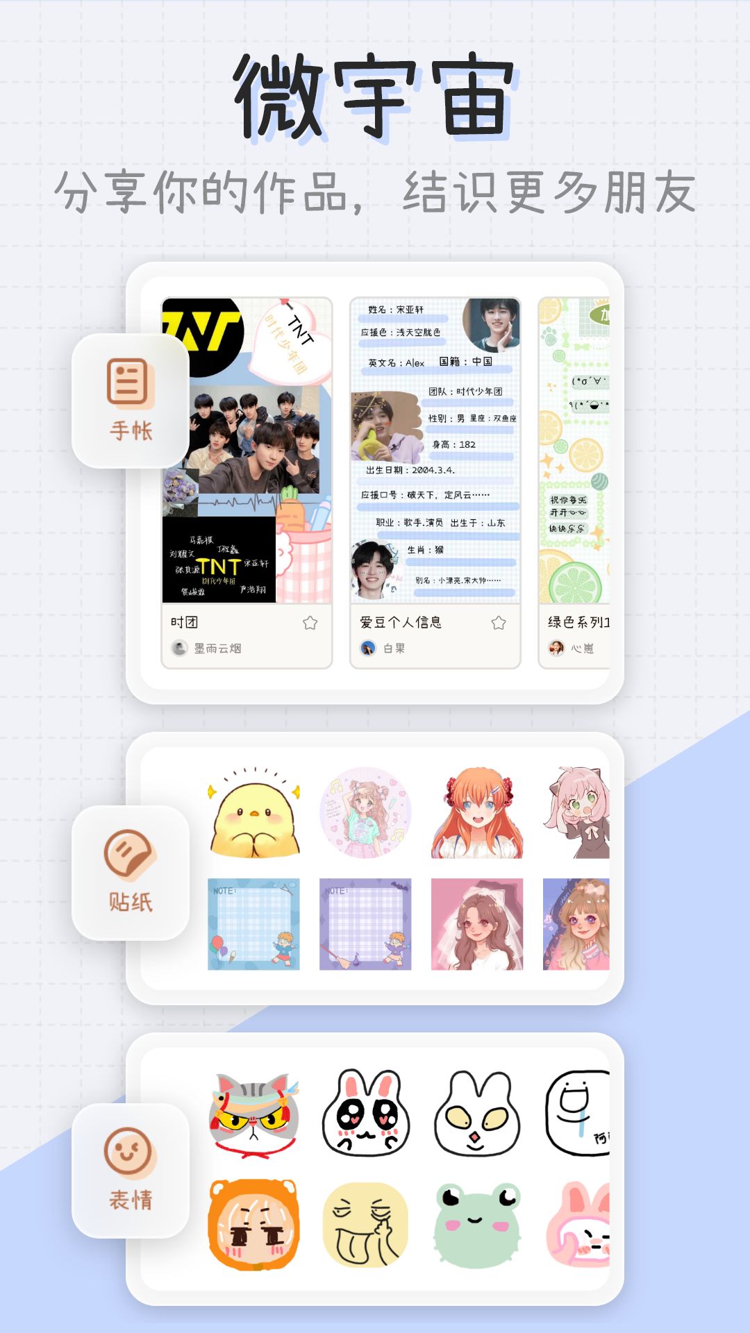 Handbook editing: Built-in multiple templates and massive sticker materials, supporting the creation of handbook collections, keyword searches, custom background colors and multi-size card sleeve designs.