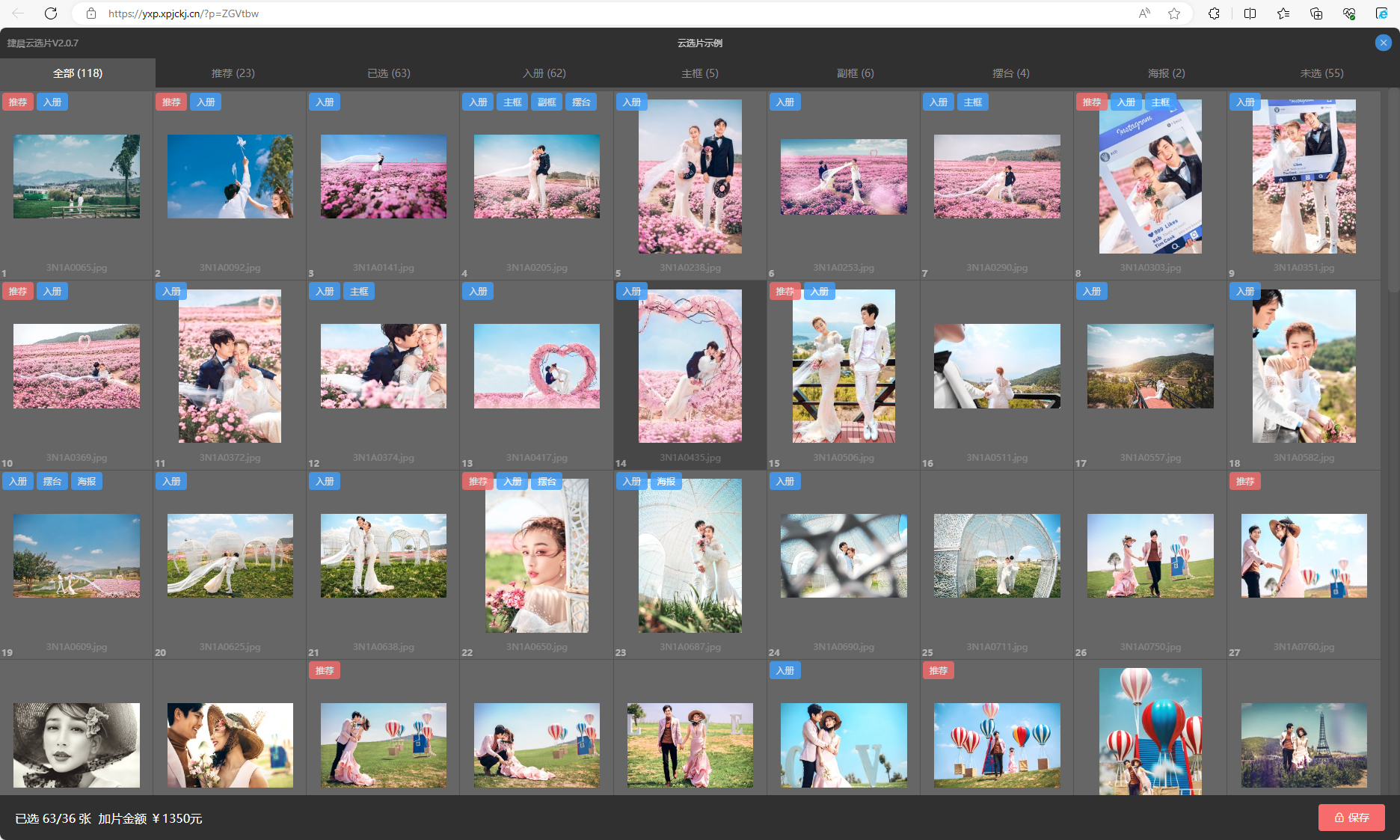 Basic capabilities: Register and log in, retrieve password, click on the store name to quickly modify the store name, custom watermarks, custom tag groups, employee accounts, employee account permission settings, basic functions of film selection tasks, customer web page film selection end, web page film selection end is compatible with different devices, quickly export film selection results, support simultaneous export of JPG and RAW.