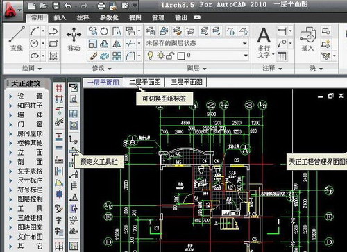 4. Tianzheng Architecture 2014 download version supports a set of engineering plan drawings to be saved in a DWG, which can be combined with other independent drawing DWG files to generate vertical sections and three-dimensional architectural models;