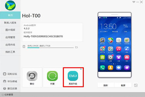 1. First, connect the device to HiSuite. After connecting, click the "System Upgrade" button at the bottom of the interface.