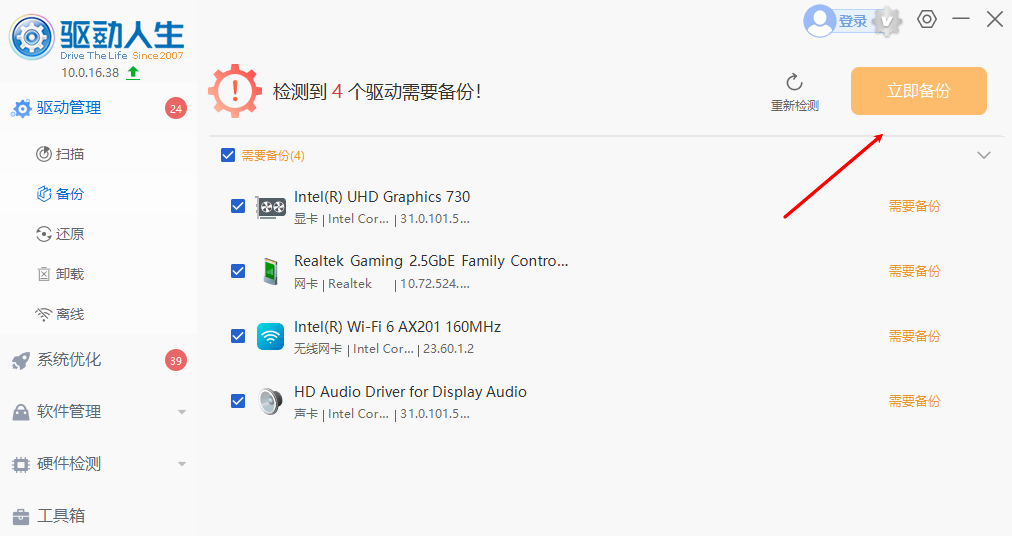 First, select the driver that needs to be backed up, and then click [Backup Now] to start backing up the driver. You can change the backup path, etc. through the backup settings.